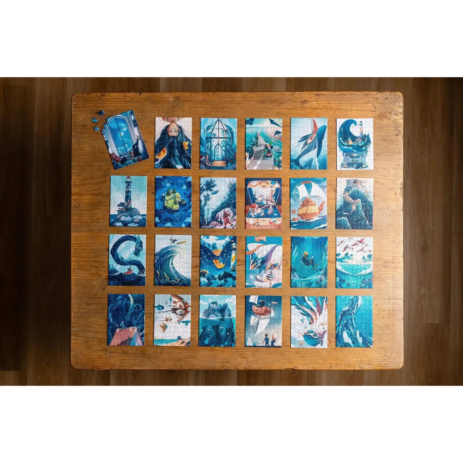 This Voyage & Merveilles box set is made up of 24 mini-puzzles of 99 pieces . They are illustrated by Eor Glas Studio. Each puzzle in this selection is an open window onto a world of marine dreams and infinite horizons. 24 illustrated puzzles that celebrate the call of the open sea, inner journeys and the magic of suspended moments.