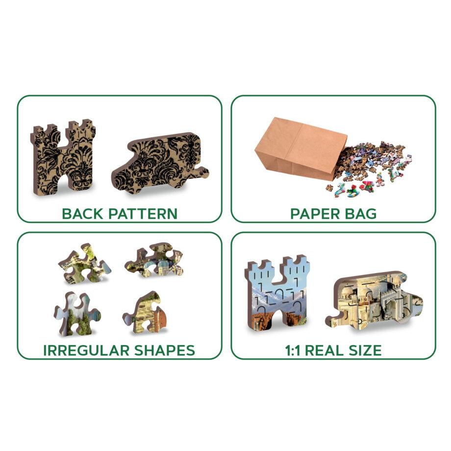 Each puzzle contains numerous unique shapes, characters, figures, and symbols that are cut seamlessly into the pattern. Think of these as mysterious little surprises each puzzle experience offers. These puzzles offer a high quality, rich beautiful image on the front and a detailed wallpaper style pattern on the back. Wooden City double-sided wooden puzzles offer a unique building experience that is sure to captivate puzzle enthusiasts of all ages.